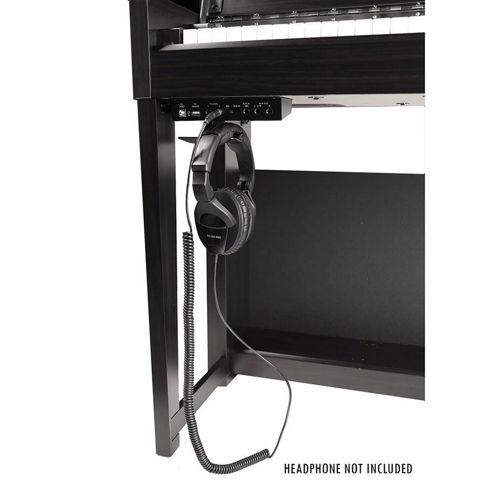 Connections: USB to host, USB to device, headphones (1/4″stereo jack), Aux/Mic in (1/4″ jack), Aux out (1/4″stereo jack), Pedals (Sustain, Soft, Sostenuto)