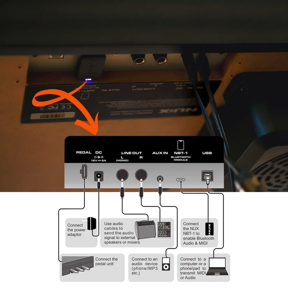 – Connectivity: 3.5mm Stereo Phones Out, 6.35mm Stereo Phones Out, 6.35mm Line Out (L/MONO, R), 3.5mm Stereo Aux In, Pedal Jack, NBT-1 Bluetooth Module Jack, USB Jack, DC 12V 2A Jack